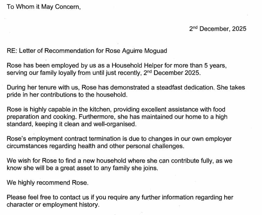 I have been working in Hong Kong for 11 years. I worked for a Chinese family of four, which included a newborn baby and two dogs, until I completed my contract. I then worked for a British family with a newborn baby and a Swedish family, both times leaving due to financial circumstances. My current employer is also experiencing financial difficulties.