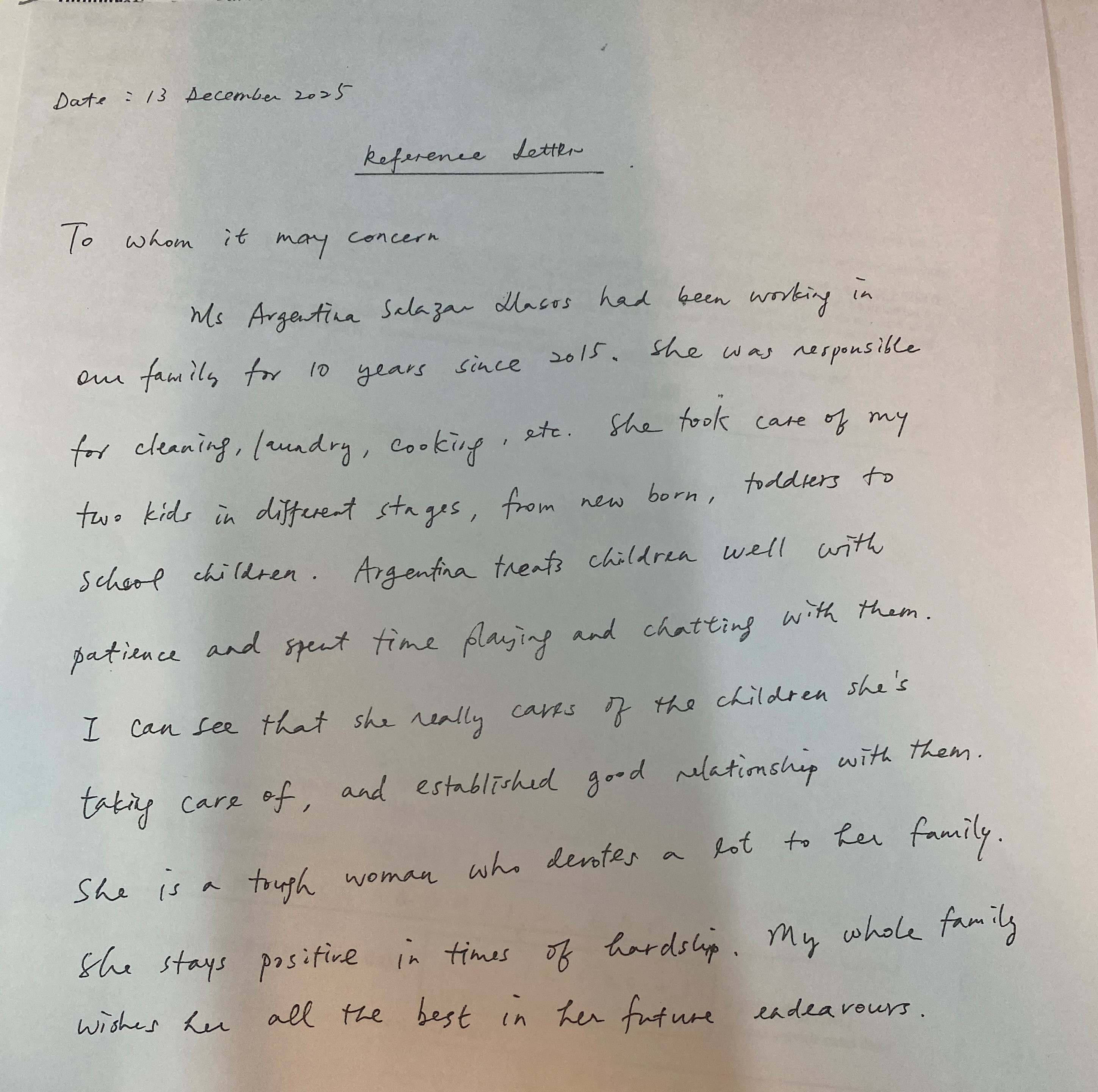 I work with one employer for 10 yrs. I took good care the children since new born up to primary school. I am responsible in cleaning, laundry, and all the chores in house, and I am willing to learn other things.