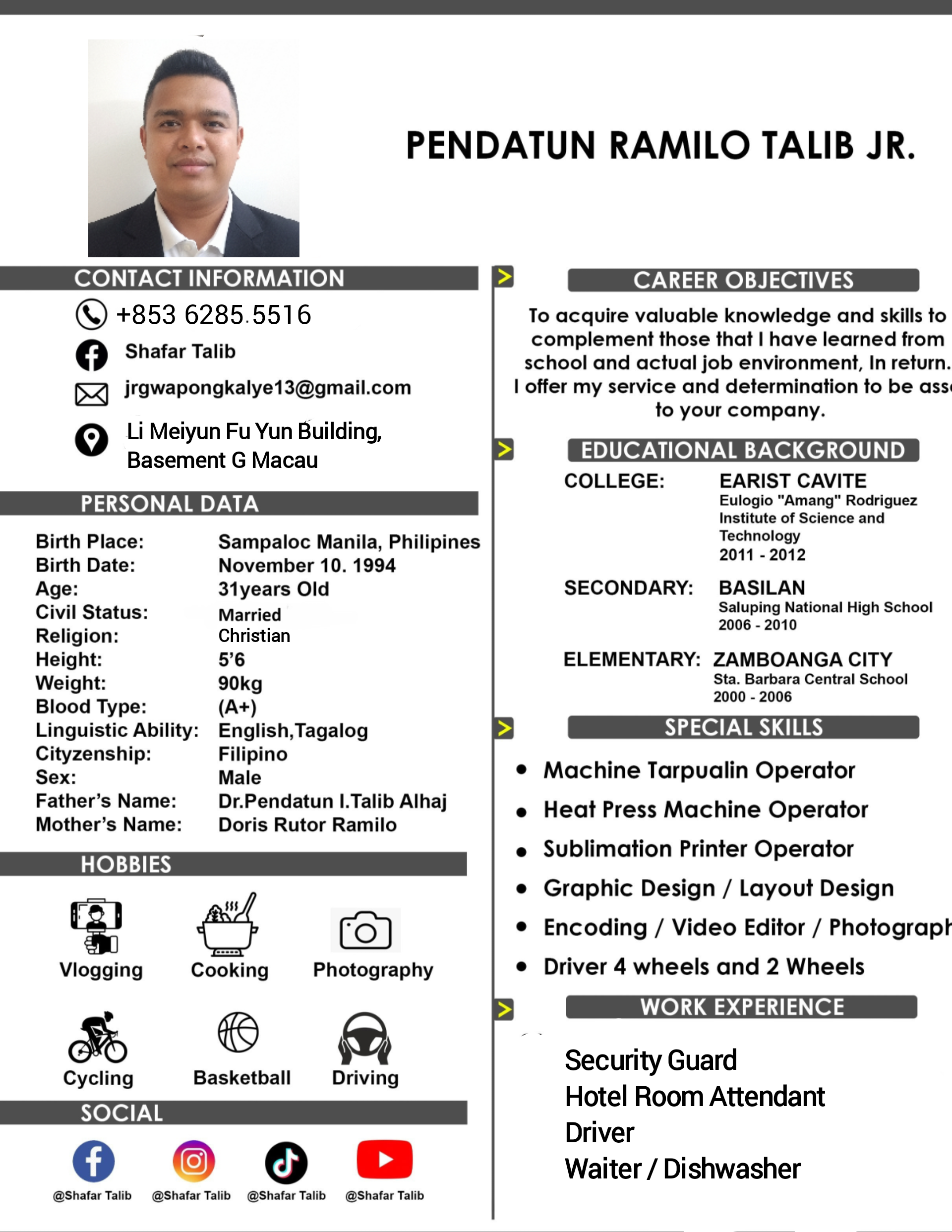 I'm a Pendatun . Graphics artist with 10 Year of experience in tarpaulin printing and layout design. I'm specialist in corel draw and Adobe Photoshop. 5 years of experience in house hold worker and take care of pet like dog and cat. I can also do gardening and car washing and simple repair and electrical work.