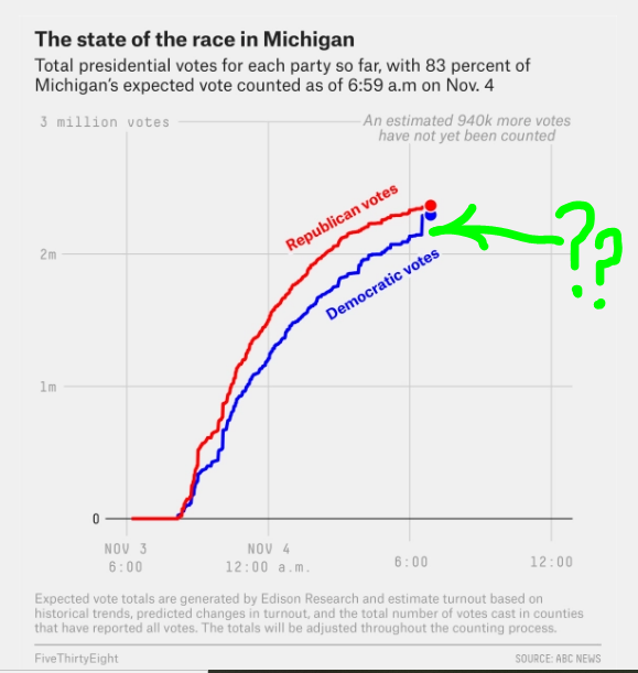 All those little fraud schemes come in from various directions, except the fraud numbers add up quick in a tight race. However, if you are behind by hundreds of thousands of votes in the middle of the night it requires some audacious level fuckery, which brings us to a red flag you can see from space. The 4 AM Biden Miracle. Here is an account from somebody at the counting center. (Source)